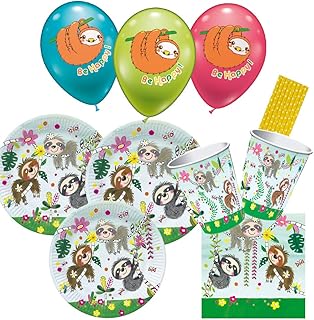 Rachel Ellen/Hobbyfun 50-teiliges Party-Set Faultier - Teller Becher Servietten Trinkhalme Luftballons für 8 Kinder