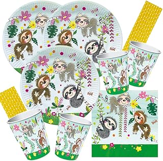 Rachel Ellen/Hobbyfun 44-teiliges Party-Set Faultier - Teller Becher Servietten Trinkhalme für 8 Kinder