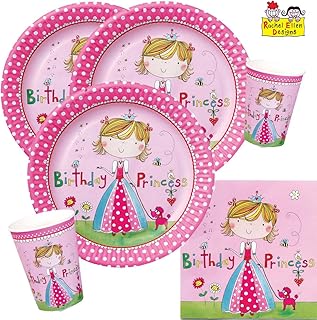 Rachel Ellen/Hobbyfun 61-teiliges Party-Set Kleine Prinzessin - Teller Becher Servietten Einladungen Partytüten Wimpelkette Trinkhalme für 8 Kinder